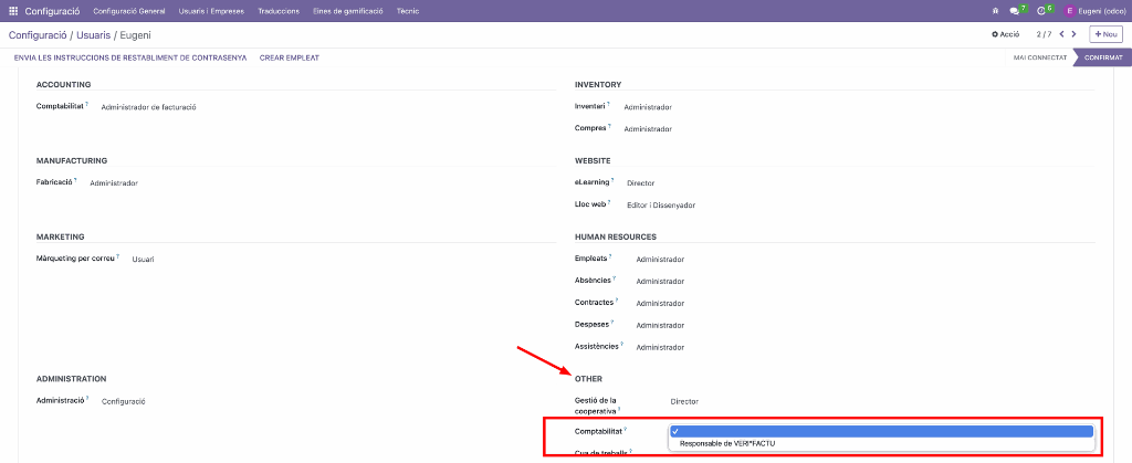 - Cal que algú de la vostra entitat tingui el permís Responsable de VERI*FACTU perquè se li notifiquin els errors en les factures. Aneu a la gestió de permisos de l'usuari i a la secció Altres (Other) trobareu l'assignació del permís Comptabilitat.