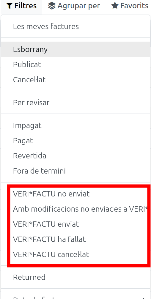 Podem veure de forma molt ràpida si hi ha hagut algun problema en l'enviament a Verifactu per alguna factura (colors vermells o grocs).